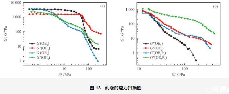 4種乳液的應力掃描結果如圖13所示。從圖13(a)中可以看出,以OE3和OE5為乳化劑制備的乳液存在線性黏彈區(qū),當應力低于屈服應力時,乳液的彈性模量(G')大于黏性模量(G''),表明乳液主要以不穩(wěn)定的彈性形式存在,乳液的不穩(wěn)定性主要與大量的水和液體石蠟有關;當應力大于屈服應力時,G'和G''都開始降低,說明乳液內部的微觀結構發(fā)生了一定程度的破壞。從圖13(a)還可發(fā)現(xiàn),以OE3為乳化劑制備的乳液比以OE5為乳化劑制備的乳液的線性黏彈區(qū)寬,說明前者乳液的穩(wěn)定性較強,體系不容易沉降或者分層。從圖13(b)中可以看出,以OE7和OE3P3為乳化劑制備的乳液在測定的應力范圍內不存在線性黏彈區(qū),當應力接近10 Pa時,兩種溶液的G'和G''就開始降低,即乳液結構遭到了破壞。根據(jù)應力掃描結果發(fā)現(xiàn),以OE3為乳化劑制備的乳液的穩(wěn)定性明顯強于其它3種乳液,這可能是因為,當分別以OE5、OE7和OE3P3為乳化劑時,由于其分子結構中長的、卷曲的EO鏈和支化的PO鏈在液滴表面形成的界面層不夠穩(wěn)定所致。