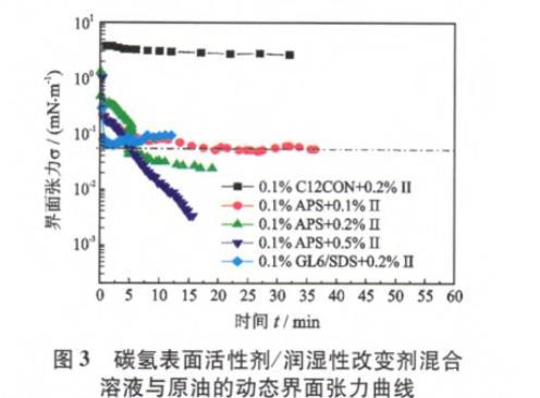圖3碳?xì)浔砻婊钚詣?潤濕性改變劑混合溶液與原油的動(dòng)態(tài)界面張力曲線