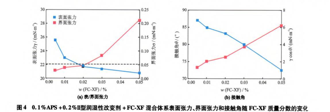 從圖4(b)中可以看出,隨著FC-XF質(zhì)量分?jǐn)?shù)由0.005%增加到0.050%,混合體系與巖石的接觸角由87°降低至73°,γcosθ由1.3 mN/m上升到6.3 mN/m。這是由于吸附Ⅱ型潤濕性改變劑和APS使得巖石表面由水濕轉(zhuǎn)變?yōu)橹行詽櫇?接觸角>87°),更易于吸附FC-XF的碳氟鏈而使親水性頭基在巖石表面暴露,增加了巖石表面的親水性,因而隨著FC-XF質(zhì)量分?jǐn)?shù)的增加接觸角減小。
