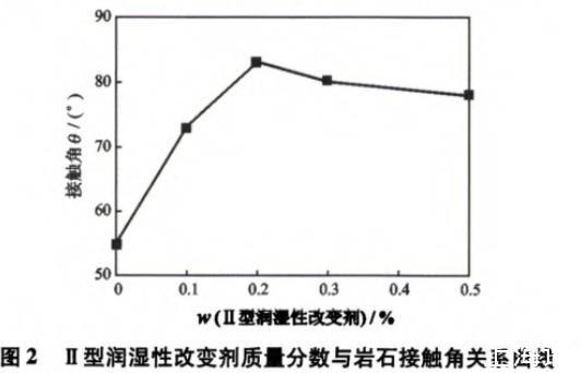 圖2為Ⅱ型潤濕性改變劑質(zhì)量分?jǐn)?shù)與巖石的接觸角之間的關(guān)系。從圖2可以看出,隨著Ⅱ型潤濕性改變劑質(zhì)量分?jǐn)?shù)的增加,接觸角由55°逐漸增大,當(dāng)加入0.2%Ⅱ型潤濕性改變劑時(shí)接觸角可達(dá)到83°,繼續(xù)增加濃度接觸角略有減小,但都大于75°。
