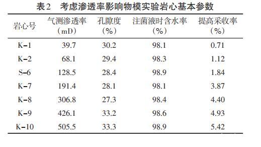 (2)效果評價及影響因素分析巖心注入0.1PV菌液,室溫放置7d后,不同滲透率油藏環(huán)境對微生物提高采收率影響顯著,由實驗結果顯示(表2),巖心滲透率從39.7mD升高至505.5mD,微生物提高采收率從0.71%升高至5.42%,隨著滲透率的增加,微生物驅油提高采收率幅度增大。