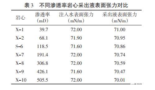 (1)實驗方法采用芬蘭Kibron EZ-Pi Plus便攜式動態(tài)表面張力儀檢測不同滲透率的巖心二次水驅采出液的表面張力。