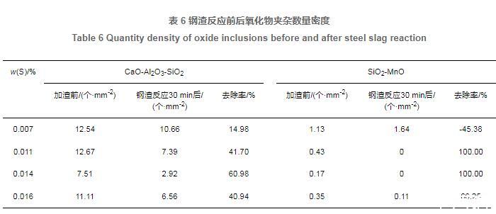 分析鋼渣反應(yīng)前后夾雜物的成分可知,重軌鋼中氧化物夾雜分為SiO2-MnO系和CaO-Al2O3-SiO2系兩類夾雜,圖8所示為兩類典型夾雜二維形貌。各類氧化物夾雜在鋼渣反應(yīng)前后數(shù)量密度變化見表6。可以看出,鋼中主要夾雜為鈣鋁硅酸鹽,因此鋼渣反應(yīng)30 min后,鈣鋁酸鹽的去除率同總氧化物夾雜的去除率相近,隨著氧、硫質(zhì)量分數(shù)的增高,鈣鋁酸鹽的去除率呈升高的趨勢。由于鋼中硅錳夾雜數(shù)量較少,且掃描面積有限,僅從以上表格統(tǒng)計的數(shù)量密度不具代表性,因此其去除率未呈現(xiàn)明顯規(guī)律。
