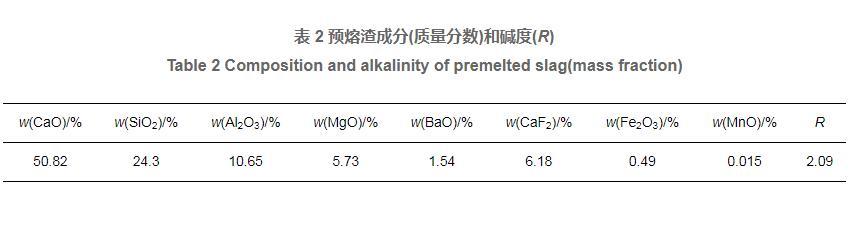 表2預(yù)熔渣成分(質(zhì)量分數(shù))和堿度(R)