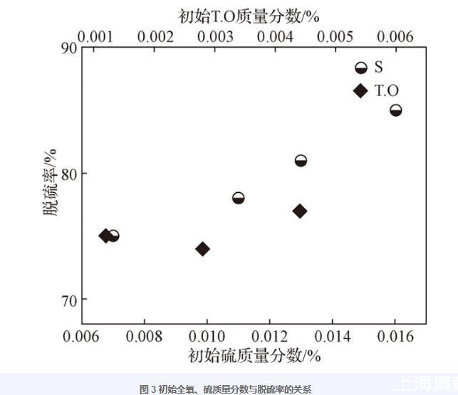 檢測每爐試樣1和試樣2的硫和全氧質(zhì)量分數(shù),結(jié)果見表3??梢钥闯?,固定鋼中全氧質(zhì)量分數(shù),隨著初始硫質(zhì)量分數(shù)的升高,鋼渣反應(yīng)30 min后,脫硫率逐漸增大,且穩(wěn)定在74%以上,終點硫質(zhì)量分數(shù)可降低到0.002 6%以下;固定鋼中硫質(zhì)量分數(shù),隨著初始全氧質(zhì)量分數(shù)的升高,終點全氧質(zhì)量分數(shù)可降低到0.001 4%以下,終點硫質(zhì)量分數(shù)可降低到0.001 8%以下,皆滿足重軌鋼的成分要求。鋼中初始硫、全氧質(zhì)量分數(shù)與脫硫率的關(guān)系如圖3所示。
