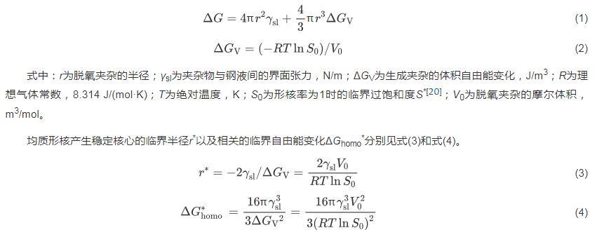 均質(zhì)形核產(chǎn)生穩(wěn)定核心的臨界半徑r*以及相關(guān)的臨界自由能變化ΔGhomo*分別見式(3)和式(4)。