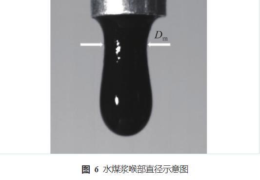 與純液體不同,由于漿體液固混合物流變性和屈服應力等參數(shù)的影響,漿體破裂過程更加復雜。在漿體破裂末期,當水煤漿液橋的喉部直徑(Dm,如圖6所示)尺寸很小時,固體顆粒將會發(fā)揮顯著影響。典型水煤漿破裂實驗照片如圖7所示,由于微觀破裂條件下液固出現(xiàn)部分分離,煤粉顆粒在液橋喉部附近凸出氣液界面,使得原本光滑的水煤漿表面逐漸粗糙,其變化特性與水煤漿黏度、表面張力和屈服應力等參數(shù)密切相關(guān)。