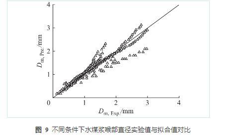 圖9所示為不同條件下水煤漿喉部直徑實驗值(Dm,EXP)和擬合值(Dm,pre)對比。從式(5)和圖9可以看出:影響水煤漿喉部破裂特性的主要參數(shù)包括動態(tài)表面張力、黏度、屈服應力等;在不同煤種和水煤漿質(zhì)量分數(shù)條件下,水煤漿破裂末期的喉部直徑變化趨勢保持一致,表明水煤漿微觀破裂過程具有一定的相似特性。