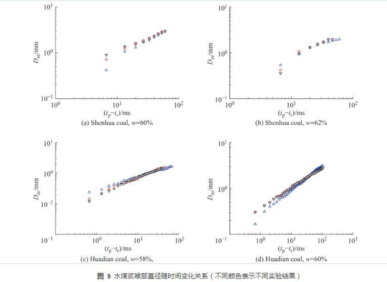 圖8水煤漿喉部直徑隨時間變化關(guān)系(不同顏色表示不同實驗結(jié)果)