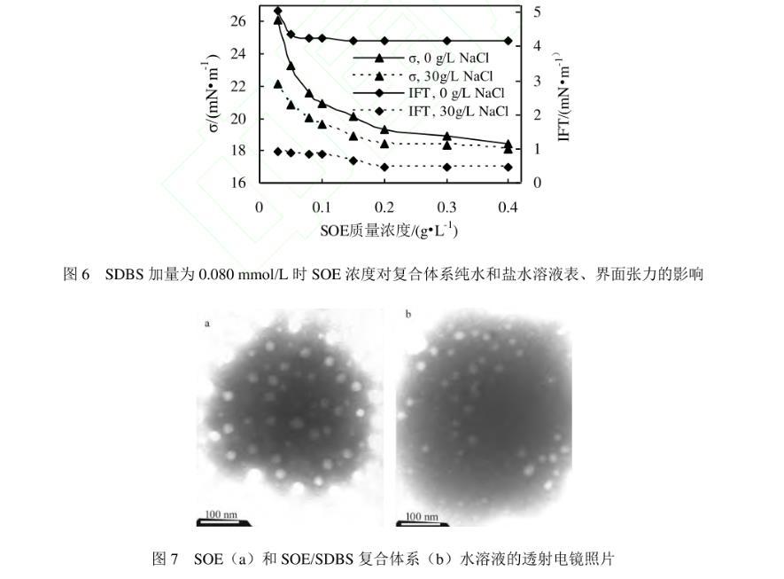 測(cè)試發(fā)現(xiàn)十二烷基苯磺酸鈉(SDBS)在純水溶液中的ccmc為0.5 mmol/L(0.174 g/L),該濃度下溶液的表、界面張力分別為27.06 mN/m和0.18 mN/m;SDBS在30 g/L NaCl溶液中的ccmc為0.080 mmol/L(0.028 g/L),該濃度下溶液的表、界面張力分別為27.62 mN/m和0.21 mN/m。因此,選擇與SOE復(fù)合的SDBS的濃度為0.08 mmol/L。