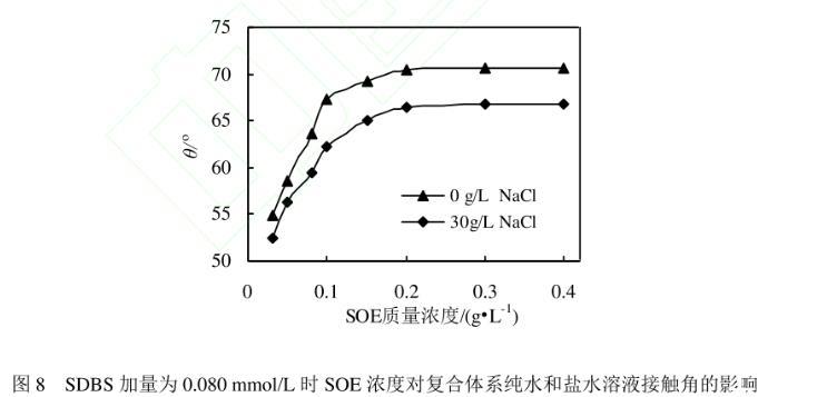 圖8 SDBS加量為0.080 mmol/L時(shí)SOE濃度對(duì)復(fù)合體系純水和鹽水溶液接觸角的影響