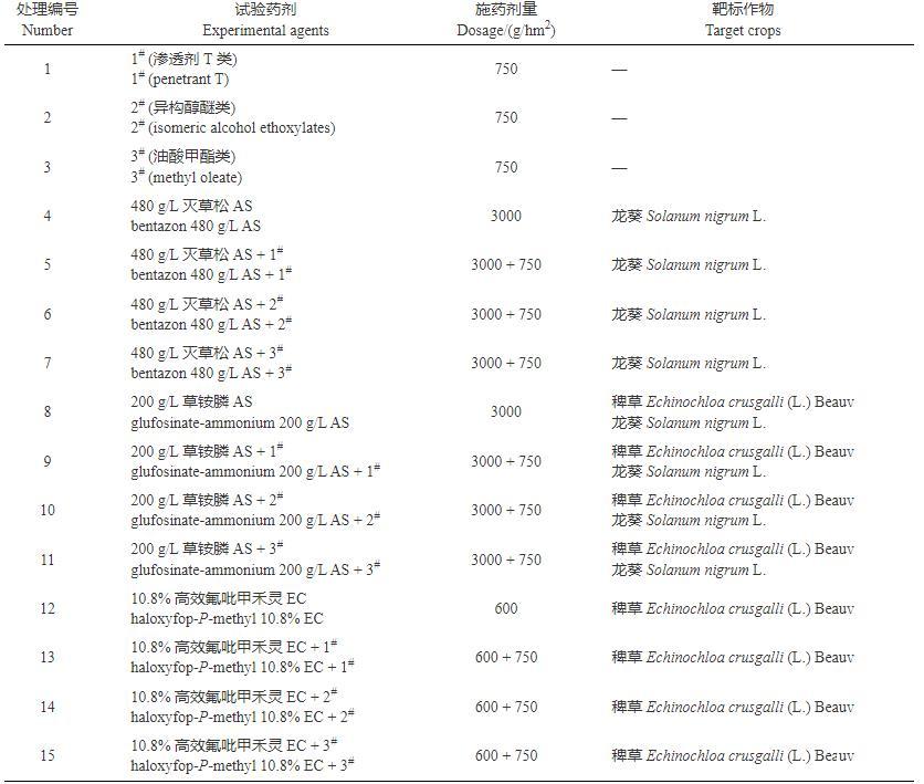 植物葉片性質(zhì)的不同會(huì)影響藥液的潤濕和持留能力。接觸角測(cè)定結(jié)果(表3)顯示:無論靶標(biāo)作物是禾本科的稗草還是闊葉科的龍葵,2#增效劑的接觸角均最小,且3種除草劑中添加2#增效劑后接觸角減小的程度最大(6,10,14),添加3#增效劑后接觸角減小的程度最小,因此,2#增效劑減小接觸角的性能最好。
