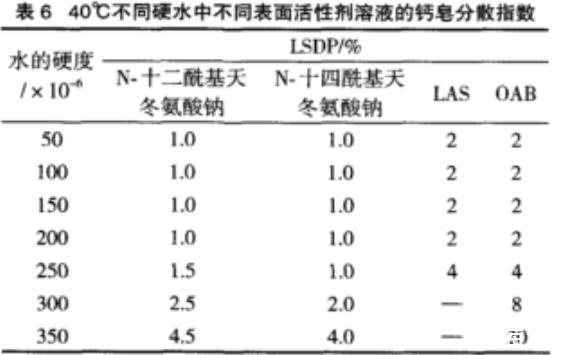 鈣皂分散的混合膠束機(jī)理認(rèn)為,一個有效的鈣皂分散劑分子結(jié)構(gòu)中必須包含一個大的極性親水頭基,這種“大”除了強(qiáng)度大外,也指體積龐大,這樣才能將肥皂分子有效隔開,使之不易形成鈣皂。N-十酰基天冬氨酸鈉和N-十四?;於彼徕c都具有類似結(jié)構(gòu),而LAS及OAB并不具有類似結(jié)構(gòu)。由表6可知,N-脂肪?;於扁c具有優(yōu)良的鈣皂分散性,N-十四?;於彼徕c更為突出,尤其是在高硬度水中,其鈣皂分散性能更為突出,說明其在硬水中具有良好的應(yīng)用前景。
