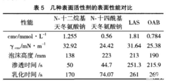 對N-十四?;於彼徕c鹽的幾項(xiàng)表面性能進(jìn)行了測定,并與其他表面活性劑進(jìn)行了對比,結(jié)果見表5。