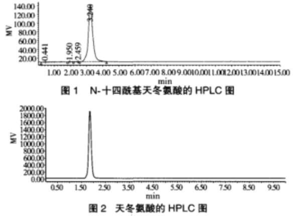 圖1為提純后最終產(chǎn)品的HPLC圖,圖2為原料天冬氨酸的液相色譜圖,圖3為副產(chǎn)物棕櫚酸的液相色譜圖。