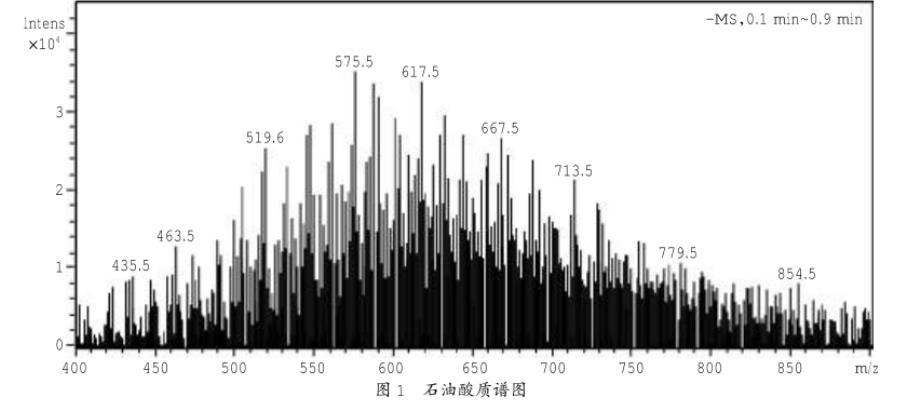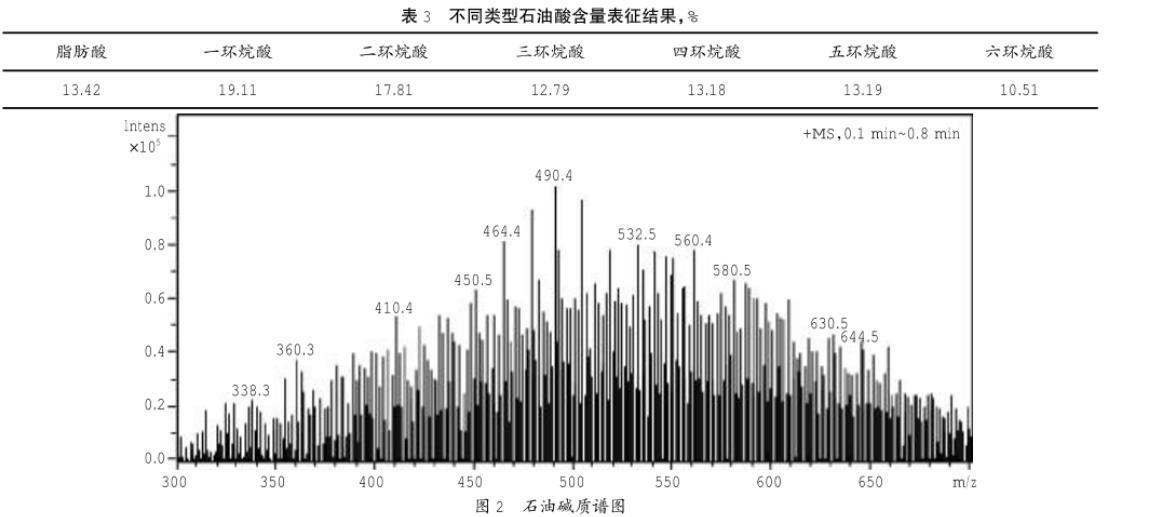 (1)萃出石油酸組分含量為3.88%,相對分子質主要分布在400~900,碳數(shù)對應C27~C62,結構以環(huán)烷酸為主;