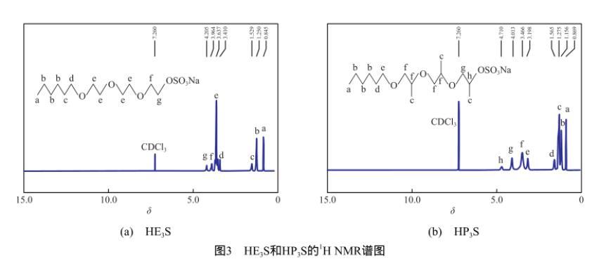 圖3為HE3S和HP3S的1H NMR譜圖。由于在合成過程中HE3和HP3為混合物,氫原子的化學位移(δ)會發(fā)生堆積,只能通過積分面積與δ確定特征基團的氫原子個數(shù),而不能確定其裂峰[11]。由圖3(a)可知,δ=0.845(3H,—CH3),1.250(6H,—CH2—),1.529(2H,—CH2—),3.410(2H,—CH2O—),3.637(8H,—OCH2CH2O—),3.964(2H,—OCH2—),4.205(2H,—CH2OSO3Na),7.260(CDCl3)。由圖3(b)可知,δ=0.869(3H,—CH3),1.156(6H,—CH2—),1.275(9H,—CH3),1.565(2H,—CH2—),3.198(2H,—CH2O—),3.466(6H,—OCH2CH—O—),4.0 1 3(2 H,—O C H2—),4.7 1 0(1H,—CH—OSO3Na),7.260(CDCl3)。