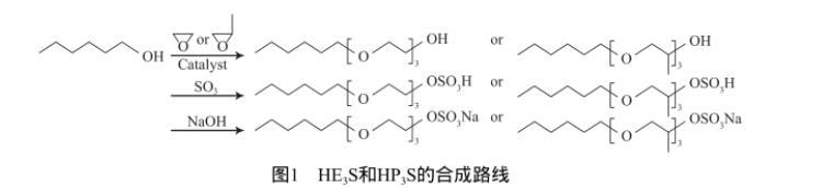 根據(jù)文獻[11]報道的方法,在高壓反應釜中加入正己醇和烷氧基化催化劑,升溫后通入環(huán)氧乙烷或環(huán)氧丙烷,分別合成正己醇聚氧乙烯醚(HE3)與正己醇聚氧丙烯醚(HP3)。隨后用經(jīng)發(fā)煙硫酸制備的三氧化硫,與HE3或HP3進行硫酸化反應后再用氫氧化鈉中和,最后經(jīng)除鹽和萃取提純得到淺黃色膏狀HE3S和HP3S,合成路線如圖1所示。