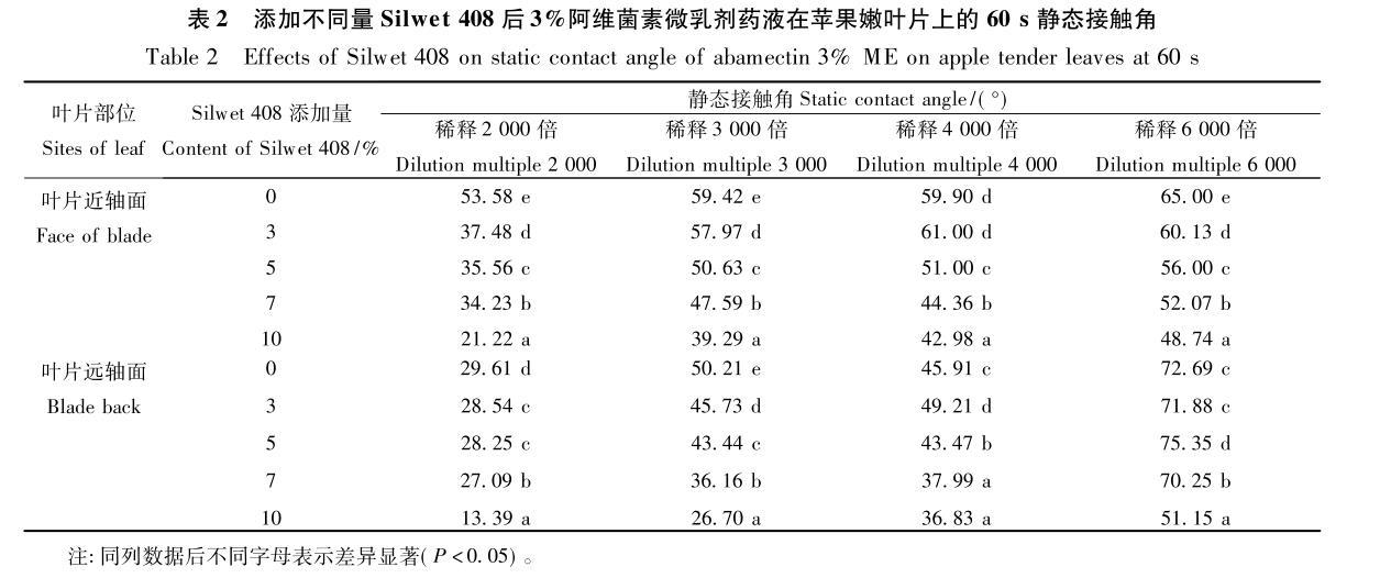 本研究表明,3%阿維菌素微乳劑中添加Silwet 408可顯著降低藥液表面張力及其在蘋果葉片上的接觸角,且表面張力和接觸角的變化與助劑添加量和葉片的狀態(tài)相關(guān)。因此在實(shí)際生產(chǎn)中,應(yīng)根據(jù)害蟲(chóng)為害的部位及葉片狀態(tài)等,有針對(duì)性地選擇適宜的表面活性劑及其添加量。
