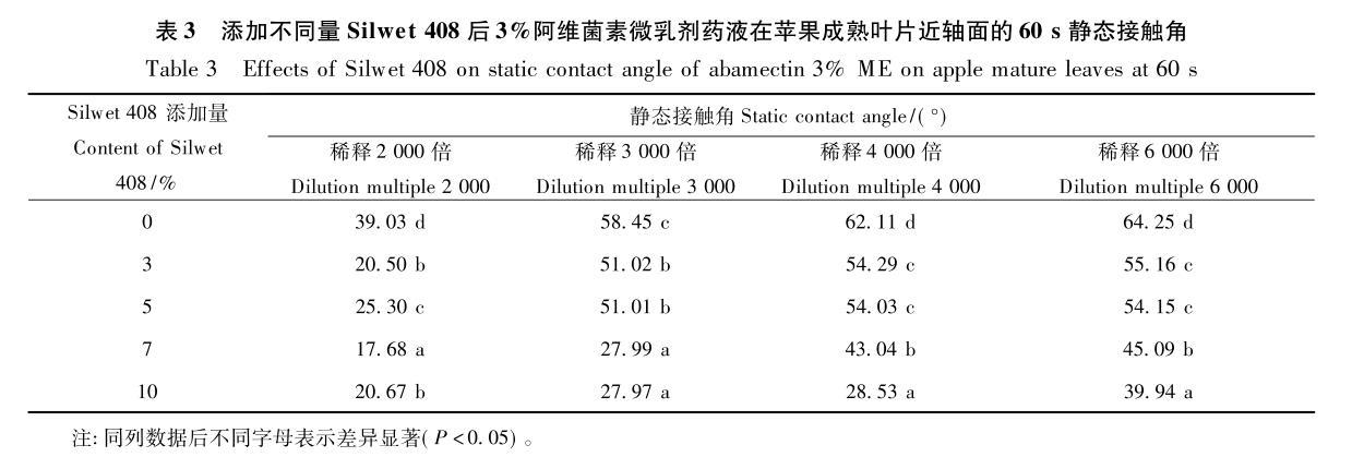 添加Silwet408可顯著改變3%阿維菌素微乳劑藥液在蘋果成熟葉片近軸面的靜態(tài)接觸角。其中,稀釋2000~4000倍時(shí),添加Silwet408后阿維菌素微乳劑藥液在成熟葉片近軸面的靜態(tài)接觸角在17.68~55.16°之間,均顯著低于未添加Silwet408時(shí)的靜態(tài)接觸角(39.03~64.25°)(表3)。與嫩葉相比,藥液在成熟葉片上的靜態(tài)接觸角更小,說(shuō)明藥液更易潤(rùn)濕成熟葉片;同時(shí),與蘋果嫩葉上的變化規(guī)律相同,隨著藥液稀釋倍數(shù)增加,其靜態(tài)接觸角呈增大趨勢(shì)。