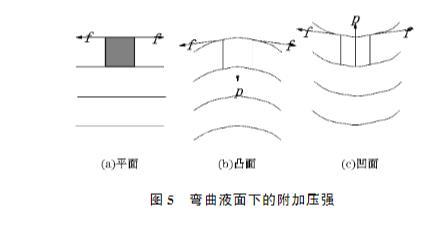 如果熔體表面是凸面,如圖5b所示,因表面張力沿周界與熔體面相切,則沿周界各個方向的表面張力f將產(chǎn)生一個指向熔體內(nèi)部的合力p(正壓力),使得熔體表面曲率變小。如果液面是凹面,如圖5c所示,表面張力的合力將指向熔體外部,對熔體則產(chǎn)生一個負壓力,使得凹面變平,甚至有可能轉(zhuǎn)化為凸面。由于表面張力的作用,熔體表面能夠截凸補凹,自動修復,表面平滑,這正是陶瓷釉層表面能夠平整光滑的主要原因。