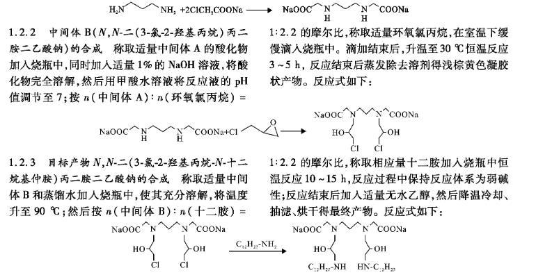 1,3-丙二胺與氯乙酸鈉反應合成中間體A(N,N-丙二胺二乙酸鈉);中間體A與環(huán)氧氯丙烷反應生成中間體B(N,N-二(3-氯-2-羥基丙烷)丙二胺二乙酸鈉);中間體B最后與十二胺反應生成目標產(chǎn)物,N,N-二(3-氯-2-羥基丙烷-N-十二烷基仲胺)丙二胺二乙酸鈉(簡稱GAC-312)。