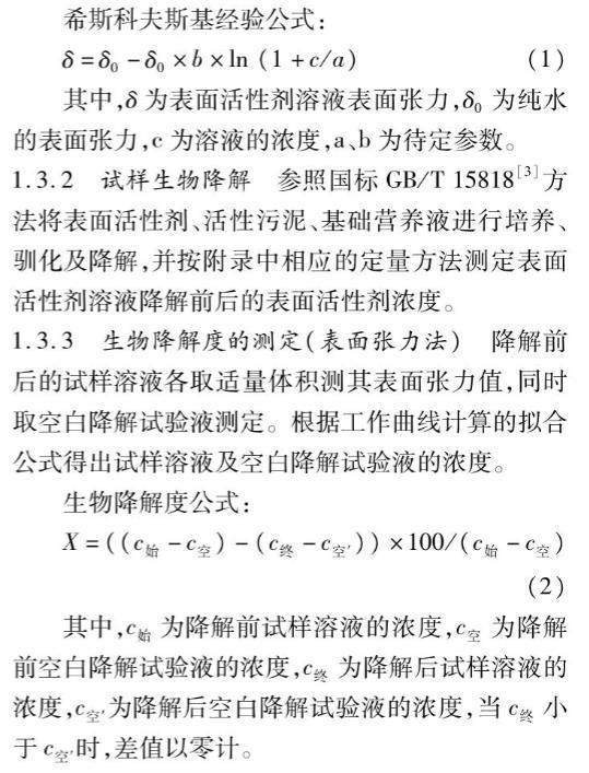 表面張力隨著表面活性劑的濃度變化而變化是表面活性劑的特性,利用該特性可以解決諸多問題。隨著表面活性劑的不斷研發(fā)探索,多種新型表面活性劑相繼上市,其中部分表面活性劑因具有獨(dú)特的分子結(jié)構(gòu)導(dǎo)致無法用傳統(tǒng)的試驗(yàn)方法測定其生物降解度。嘗試用表面張力法解決該問題,并與標(biāo)準(zhǔn)規(guī)定的方法做對比,分析該方法的可行性。