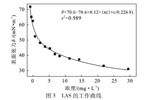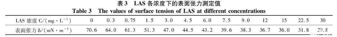LAS是應(yīng)用最廣泛的陰離子表面活性劑,是我國合成洗滌劑活性物的主要構(gòu)成,可用作洗衣粉、香波、金屬清洗劑、脫墨劑等產(chǎn)品的原料,分析其生物降解性能十分必要。LAS試樣在不同濃度時(shí)測定的表面張力結(jié)果見表3。