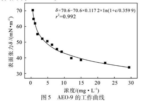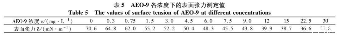 脂肪醇聚氧乙烯醚(AEO-9)是一種非離子表面活性劑,該類表面活性劑是非離子表面活性劑中發(fā)展最快、用量最大的品種。AEO-9試樣的表面張力測定結(jié)果見表5。