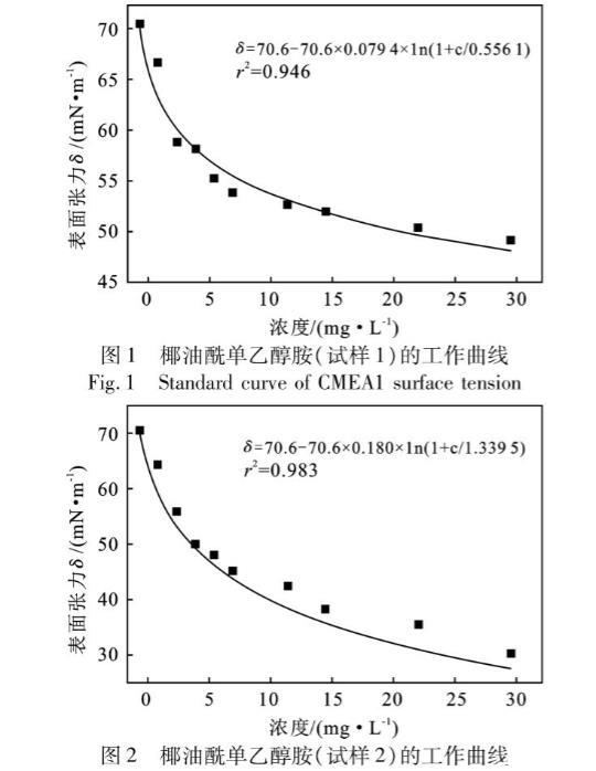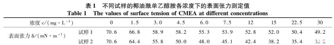 椰油酰單乙醇胺溶液的表面張力測定結(jié)果見表1。