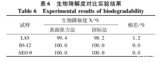 對比兩種方法得出的生物降解度,由表6可知,表面張力法計(jì)算得出的生物降解度比國標(biāo)法測定的結(jié)果偏高或者一致,兩者相差小于2%,可認(rèn)為兩種方法均可測定表面活性劑的生物降解度,其結(jié)果均可信。