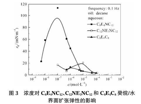 圖3濃度對(duì)C8E4NC12、C12NE3NC12和C8E4C8癸烷/水界面擴(kuò)張彈性的影響