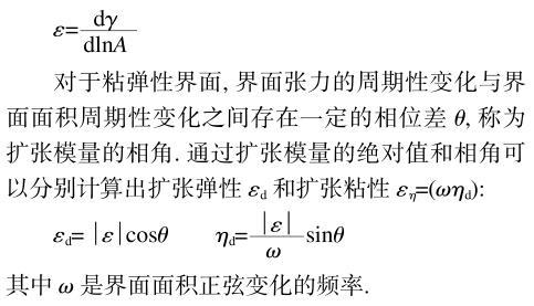 當(dāng)界面受到周期性壓縮和擴(kuò)張時(shí),界面張力也隨之發(fā)生周期性變化,擴(kuò)張模量ε定義為界面張力(γ)變化相對(duì)于相對(duì)界面面積(A)變化的比值。即