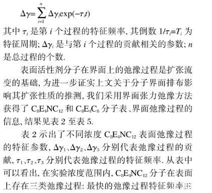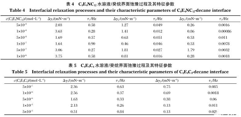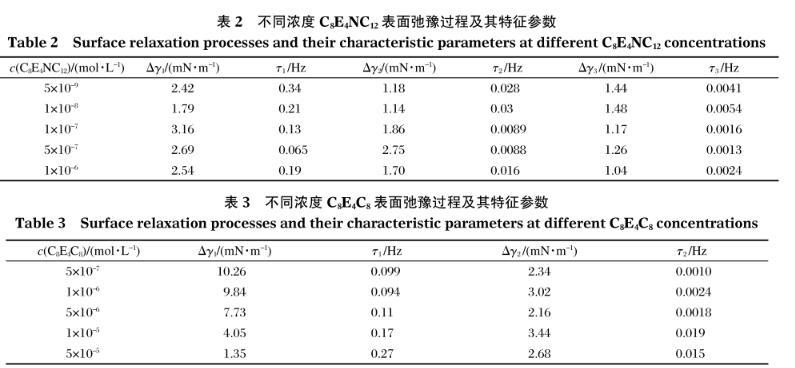 表5 C8E4C8水溶液/癸烷界面弛豫過(guò)程及其特征參數(shù)