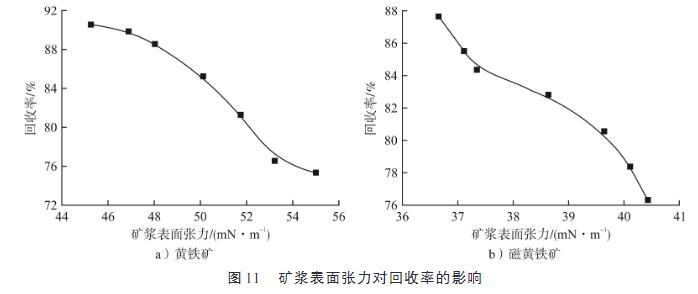 由圖11可知:礦漿表面張力與回收率之間存在顯著的負(fù)相關(guān)性,即礦漿表面張力的降低與黃鐵礦和磁黃鐵礦回收率的提高呈正相關(guān)。這一現(xiàn)象可歸因于礦漿表面張力在浮選過程中對泡沫形成及其穩(wěn)定性的影響。具體而言,降低礦漿表面張力可減少泡沫生成過程中的能量消耗,從而促進(jìn)泡沫的形成。同時,礦漿表面張力的降低亦可減小Plateau邊界與其他泡沫邊界間的壓力差,降低液膜厚度,減小破裂速率,增強(qiáng)泡沫穩(wěn)定性。因此,礦漿表面張力的降低對于提升黃鐵礦和磁黃鐵礦的回收率具有積極影響。