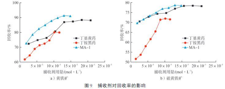 由圖9可知:黃鐵礦與磁黃鐵礦的回收率整體均隨著捕收劑用量的增加而逐漸提升;當(dāng)回收率達(dá)到峰值后,繼續(xù)增加捕收劑用量,回收率趨于穩(wěn)定狀態(tài)。相較于丁銨黑藥和丁基黃藥,MA-1作為黃鐵礦的捕收劑性能更佳。在磁黃鐵礦的浮選過程中,使用丁基黃藥和MA-1作為捕收劑時,回收率差異不顯著。鑒于實際生產(chǎn)過程中簡化藥劑制度和降低藥劑成本的考量,丁基黃藥更適宜作為磁黃鐵礦捕收劑。