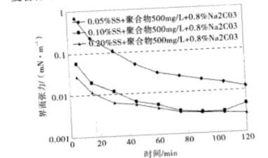 圖1石油磺酸鹽+聚合物500 mg/L+1.2%Na2CO3復(fù)配體系的動態(tài)界面張力(mN/m)