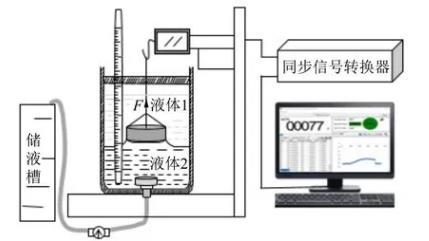 圖1為自制2種液體間界面張力的動(dòng)態(tài)實(shí)時(shí)測量裝置圖,該儀器主要包括電腦顯示器、同步信號(hào)轉(zhuǎn)換器、自制實(shí)驗(yàn)架臺(tái)、力敏傳感器、金屬吊環(huán)、恒溫杯、溫度計(jì)、排液孔、排液管、流速調(diào)節(jié)器和儲(chǔ)液槽等組成.