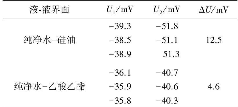 實(shí)驗(yàn)測量所用金屬吊環(huán)的外徑、內(nèi)徑分別為0.034 96 m和0.033 10 m.在20℃實(shí)驗(yàn)條件下,采用自制2種液體間界面張力的動(dòng)態(tài)實(shí)時(shí)測量儀,測量了純凈水-硅油和純凈水-乙酸乙酯間的界面張力.測量出金屬吊環(huán)由液體I中完全進(jìn)入液體Ⅱ的過程中,液體I的液膜被拉斷前電壓的最大值U1,拉斷后趨于穩(wěn)定時(shí)的電壓值為U2,數(shù)據(jù)結(jié)果如表1所示.