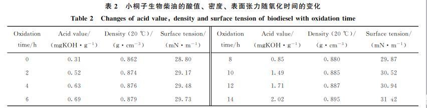不同氧化時(shí)間小桐子油生物柴油的酸值、表面張力與密度的測(cè)定結(jié)果如表2所示。從表2可得,氧化14h的小桐子生物柴油的酸值由未被氧化時(shí)的0.31 mgKOH/g增加到2.02 mgKOH/g,增加了551%,超過(guò)ASTM D6751(2001)中規(guī)定生物柴油酸值的最大值(0.5 mgKOH/g)。這是由于小桐子生物柴油在氧化后期形成了一些醛類,如己醛和壬醛(見(jiàn)表1),這些醛類經(jīng)過(guò)復(fù)雜的二次氧化反應(yīng)轉(zhuǎn)化為酸類物質(zhì),從而導(dǎo)致酸值增加;同時(shí),生物柴油會(huì)吸收水分,導(dǎo)致酯的水解,也可使酸值增加。