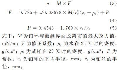 式中:M為鉑環(huán)與被測(cè)界面脫離前的最大拉力值,mN/m;F為修正系數(shù);rho_0為水在25℃時(shí)的密度,g/cm3;rho_1為試樣在25℃時(shí)的密度,g/cm3;P為常數(shù);r_0為鉑環(huán)的平均半徑,mm;r_1為鉑絲的半徑,mm。