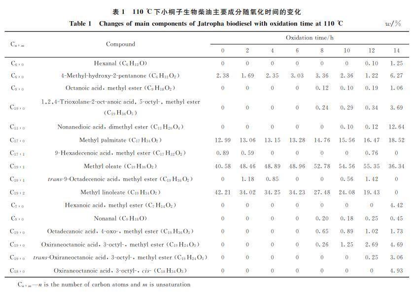 小桐子生物柴油氧化期間GC-MS組成分析結(jié)果見(jiàn)表1。由表1可知,小桐子生物柴油的主要成分是棕櫚酸甲酯、油酸甲酯、亞油酸甲酯,歸一化后的質(zhì)量分?jǐn)?shù)為95.78%。在氧化過(guò)程中,含有2個(gè)碳碳雙鍵的亞油酸甲酯的含量降低,氧化0h的小桐子生物柴油亞油酸甲酯(C19:2)質(zhì)量分?jǐn)?shù)為42.21%,加速氧化14h,質(zhì)量分?jǐn)?shù)為0,說(shuō)明亞油酸甲酯幾乎完全氧化,這是因?yàn)槎嗖伙柡椭舅峒柞ケ葐尾伙柡椭舅峒柞ジ菀籽趸?。與單不飽和脂肪酸相比,亞油酸甲酯的碳鏈含有更多的雙烯丙基位點(diǎn),雙烯丙基質(zhì)子對(duì)氧自由基的攻擊敏感,導(dǎo)致分子發(fā)生氧化,從而形成過(guò)氧化合物,過(guò)氧化合物進(jìn)一步氧化轉(zhuǎn)化成醛、酮等化合物。