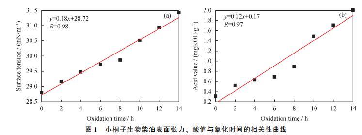 由圖1可得:表面張力、酸值與氧化時(shí)間均呈正相關(guān);擬合方程分別為y=0.18x+28.72,y=0.12x+0.17;擬合系數(shù)分別為0.98與0.97,具有較好的擬合效果。