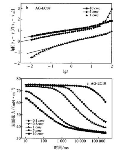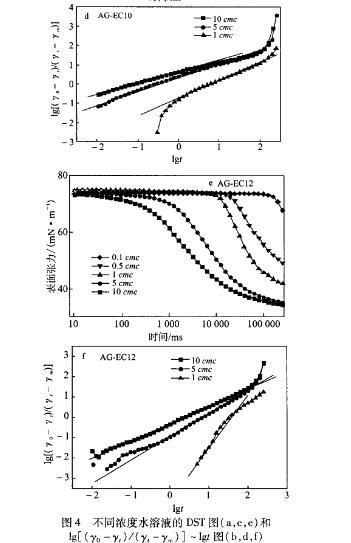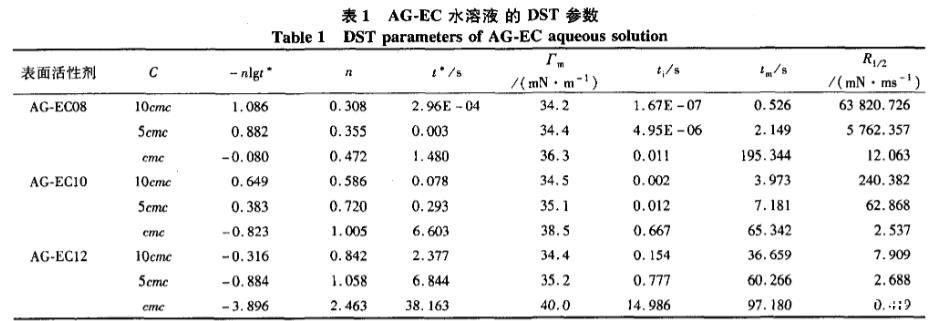 在25cc下測定不同濃度AG.EC水溶液的DST,并利用Rosen模型處理,得到其動(dòng)態(tài)表面張力參數(shù),見圖4、表1。