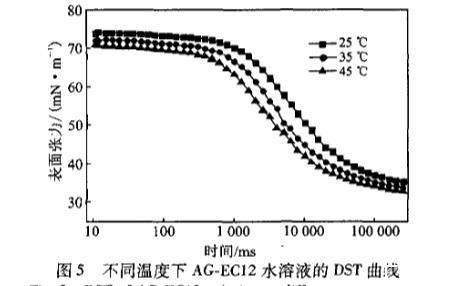 由圖5可知,當(dāng)溫度升高,DST下降的速率明顯加快。這是因?yàn)榉肿拥牟灰?guī)則運(yùn)動(dòng)更加激烈,使得分子間的引力減小。表面張力越早開始下降,在各個(gè)階段的表面張力值就越低。在45℃下開始測量時(shí),表面張力已經(jīng)降到了70mN/m左右,這也許是由于溫度升高降低了純?nèi)軇┧谋砻鎻埩?。升高溫度,表面張力下降的更快,更易達(dá)到第四個(gè)階段平衡狀態(tài)。這說明了高溫下其動(dòng)態(tài)表面活性更好??赡苁怯捎诒砻婊罨茉诟邷貢r(shí)更低,使得AG.EC分子更易在溶液表面吸附。