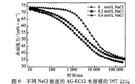 2.2.4氯化鈉對烷基糖苷檸檬酸單酯二鈉鹽水溶液動(dòng)態(tài)表面張力的影響在表面活性劑溶液中加入電解質(zhì)會(huì)顯著的改變?nèi)芤旱腄ST,特別是對于離子型表面活性劑。為了研究無機(jī)鹽對AG.EC水溶液動(dòng)態(tài)表面張力的影響,這里選擇NaC1濃度為0.2,0.6moL/L的AG.EC12水溶液(AG—EC12濃度為1.13mmol/L),測定其DST,并與無NaC1時(shí)的DST對比,結(jié)果見圖6。