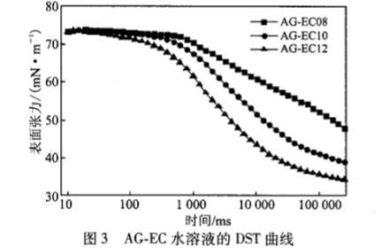 由圖3可知,對于不同鏈長的AG.EC水溶液,其DST曲線都是微微下降一快速下降一緩慢平衡的過程。另外在疏水鏈變長的同時(shí),DST曲線的誘導(dǎo)期時(shí)間縮短,DST下降趨勢增加,介平衡狀態(tài)表面張力值越低。這是由于疏水烷基鏈增長使得表面活性劑的疏水性增強(qiáng),更容易吸附到溶液的表面。