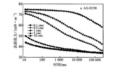 2.2.1烷基糖苷檸檬酸單酯二鈉鹽的烷基鏈長對其水溶液動(dòng)態(tài)表面張力的影響圖3為不同烷基鏈長的AG-EC水溶液(2.26mmoL/L)的DST隨時(shí)間變化的情況。