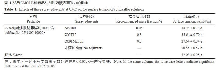 當(dāng)溶液中的表面活性物質(zhì)的質(zhì)量濃度達到其CMC時,液體具有良好的吸附和潤濕性,因此確定助劑的最低施用濃度以大于等于其CMC為依據(jù)。3種噴霧助劑的CMC測定結(jié)果見圖1。NF-100、GY-T12和邁潤3種噴霧助劑的CMC的對數(shù)值分別為2.40、3.43和3.46,得到其CMC分別為250、2708和2877 mg/L,其中糖基類表面活性劑NF-100具有更低的CMC,比另外兩種低一個數(shù)量級。根據(jù)助劑添加量應(yīng)適當(dāng)大于其CMC的原則,考慮量取方便,將NF-100的添加量確定為500 mg/L、折算為質(zhì)量分數(shù)0.05%,將GY-T12和邁潤的添加量確定為3000 mg/L、折算為質(zhì)量分數(shù)0.3%。在此添加量下,測定了3種噴霧助劑對氟啶蟲胺腈藥液表面張力的影響。結(jié)果(表1)表明,添加NF-100、GY-T12和邁潤3種助劑后,氟啶蟲胺腈藥液的表面張力顯著降低,由未添加助劑時的50.65 mN/m分別降低至34.03、35.64和27.64 mN/m,其中邁潤對藥液表面張力的降低效果最顯著,3種助劑之間均存在顯著差異(P<0.05)。
