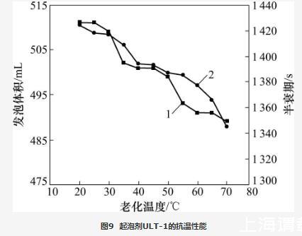將起泡劑溶液在一定溫度下老化一定時(shí)間后,測試其發(fā)泡體積和泡沫半衰期的變化以評價(jià)其抗溫性能。稱取0.2 g起泡劑ULT-1于攪拌杯中,加入100 mL蒸餾水,置于攪拌器之上,以轉(zhuǎn)速11 000 r/min攪拌1 min。裝入老化罐,放入滾子加熱爐,在一定溫度下滾動16 h,取出冷卻至室溫,以轉(zhuǎn)速11 000 r/min攪拌1 min,測量發(fā)泡體積和半衰期。通過改變老化溫度測量起泡性能與老化溫度的關(guān)系,結(jié)果如圖9所示。從圖9可知:0.2%的新型起泡劑溶液在一定溫度范圍內(nèi)(20~70℃),隨著老化溫度的升高起泡性能基本不變,表明研制的新型起泡劑ULT-1具有較好的抗溫性能。